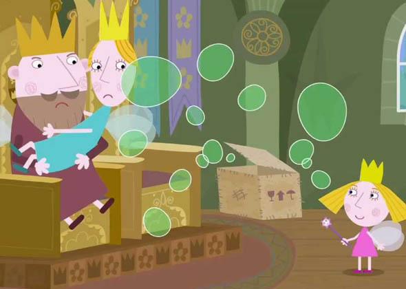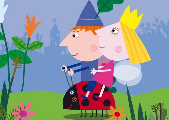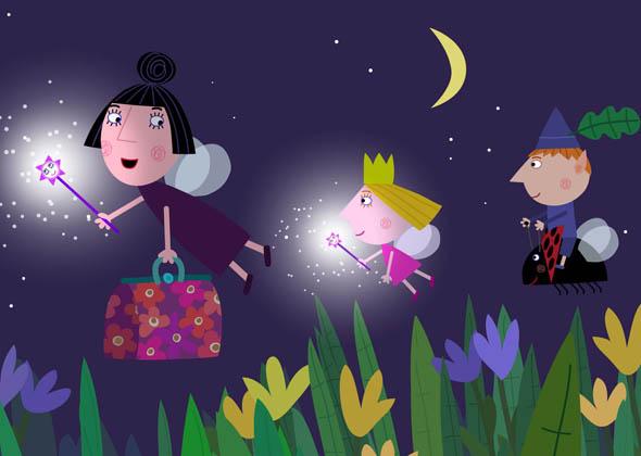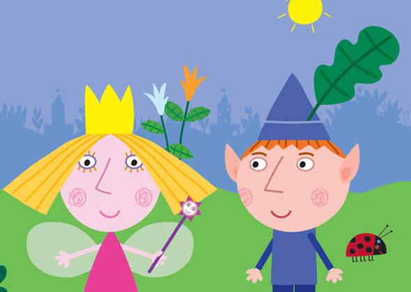 Ben and Holly’s Little Kingdom is a ten minute animation series for pre-school children set in a tiny land of elves, fairies, small animals and insects. These characters are so small that to them flowers and blades of grass seem like mighty trees. Each episode combines situations that will be familiar to small children (including playing games, snowy days, holidays, birthdays, bathtime) with the magical elements that are part of everyday life for fairies and elves. The stories revolve around the daily lives of Holly, a tiny five-year-old fairy princess and her best friend Ben, an elf of the same age. Because Holly is a young fairy she is still learning how to do magic properly and her spells often don’t work out quite as planned. She also has quite a bit to learn about flying and mostly flutters close to the ground. Ben is a young elf. Elves can’t do magic and they don’t have wings. But elves are very brave, can run fast and are very good at making things – especially toys. Ben is extremely proud of being elf.