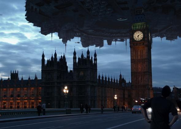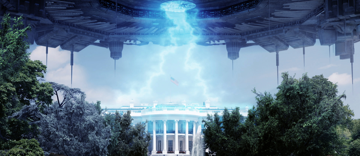 巨大飛碟載著外星人劃過地球上空,準備摧毀白宮並展開侵略。
